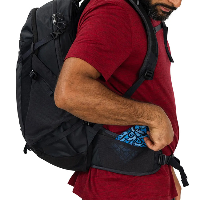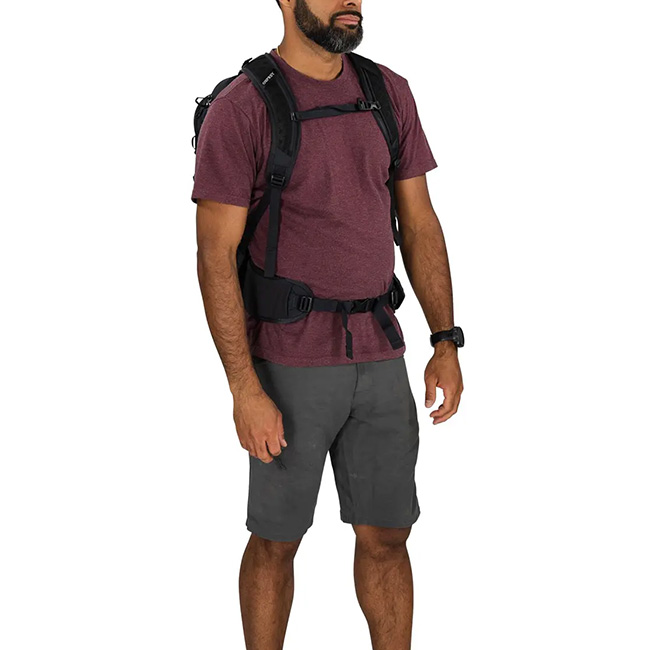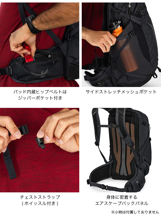 荷物をすぐに取り出せるショービットポケットを正面に装備。調整可能なショルダーベルト、身体に密着するエアスケープバックパネル、パッド内蔵ヒップベルト、チェストストラップなど快適機能が満載。