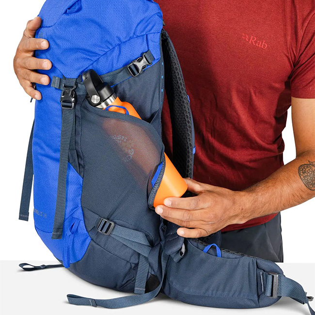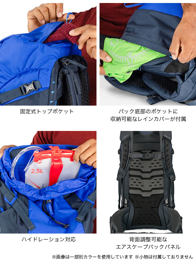 メイン荷室の上部にはトップリッドを備えるほか、ヒップベルトポケットに必需品を収納できます。