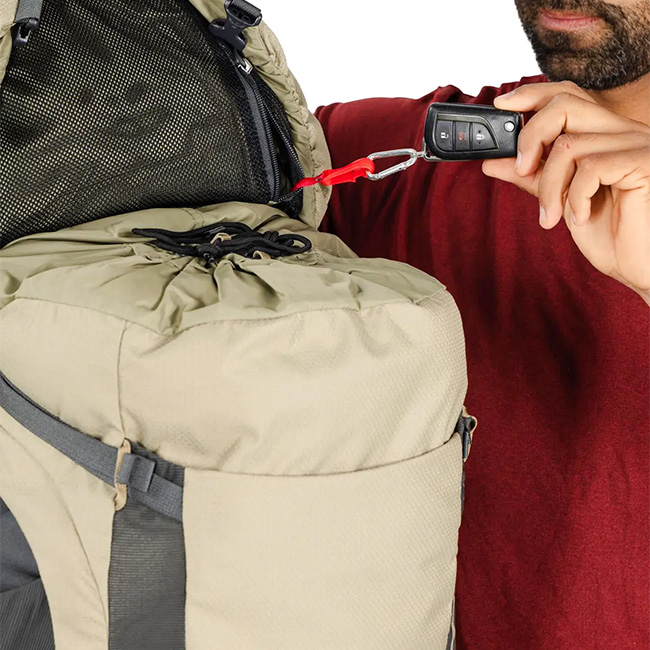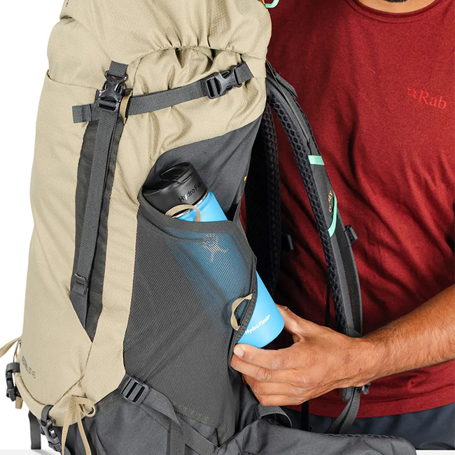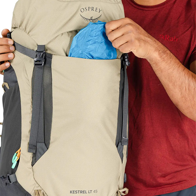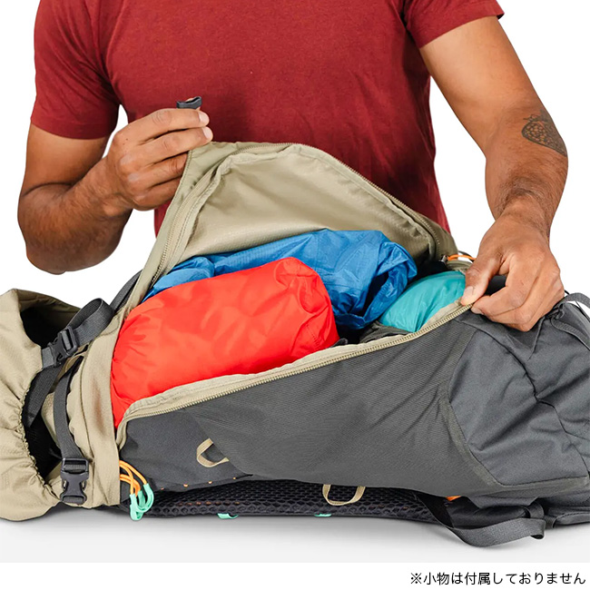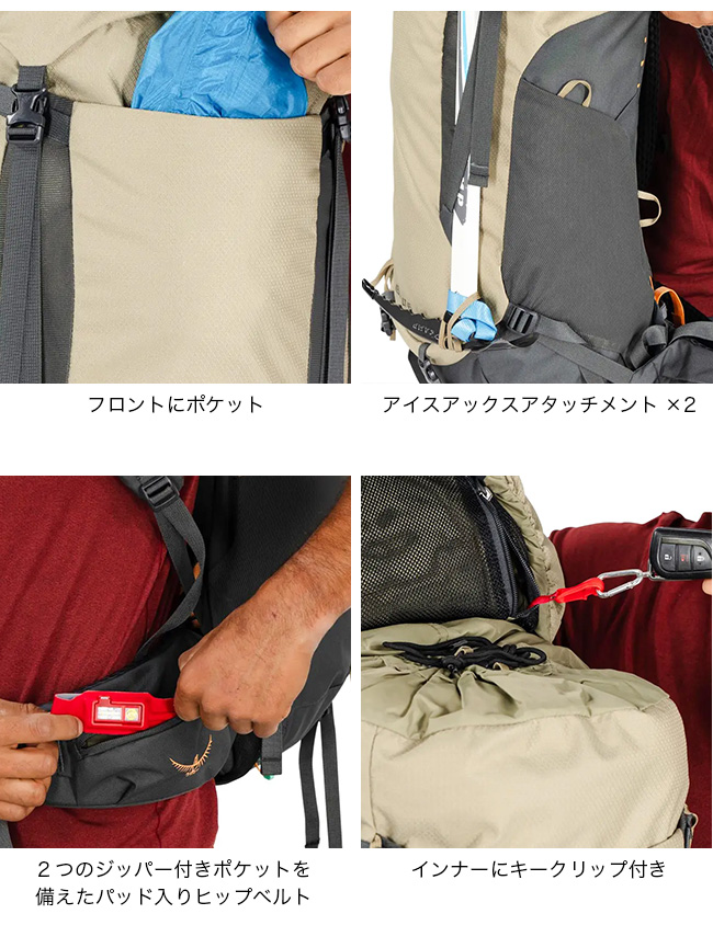 メイン荷室の上部にはトップリッドを備え、フロントの収納ポケットとヒップベルトポケットに必需品を収納できます。