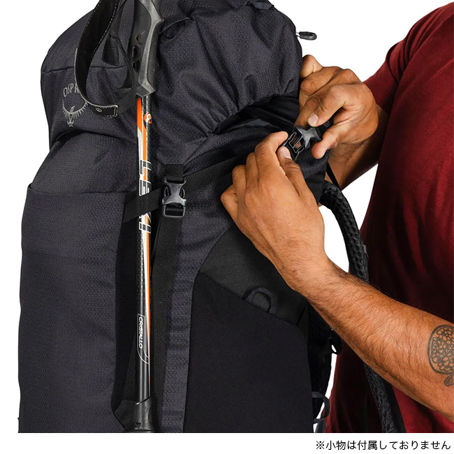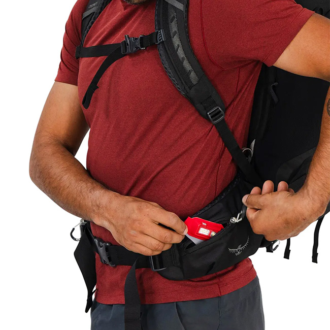 メイン荷室の上部にはトップリッドを備え、フロントの収納ポケットとヒップベルトポケットに必需品を収納できます。
