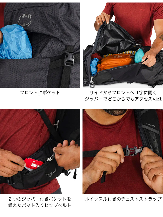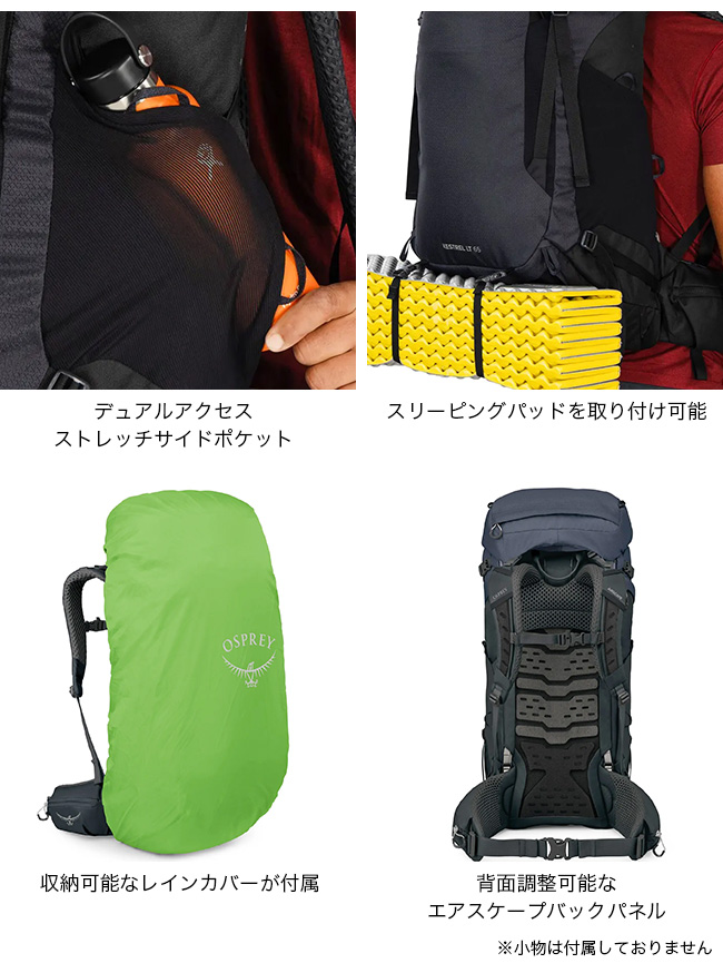 65リットルはテント山行や長期の山小屋泊に対応します。クッション性が高く身体にぴったりとフィットするエアスケープバックパネルが、快適でバランスの良い背負い心地を実現。