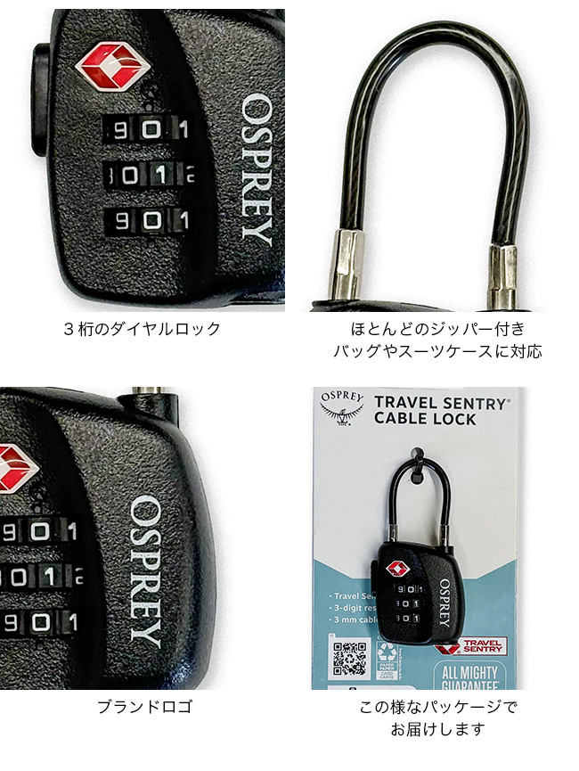 オスプレー トラベルセントリーケーブルロック OSPREY OS58043 鍵 スーツケース キャリーケース 海外旅行 長期旅行 出張 キャンプ アウトドア