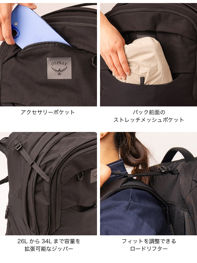また、26Lから34Lまで拡張可能なジッパーを備えており、荷物が急に増えたときやちょっとした出張にも対応します。