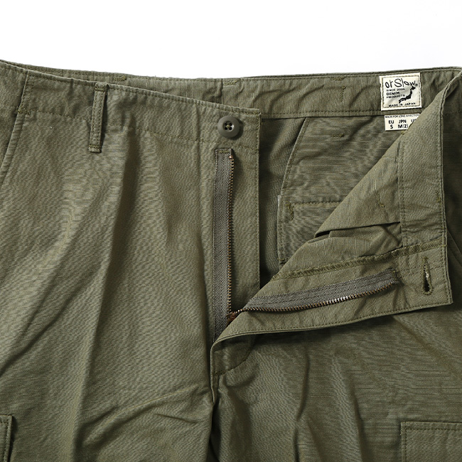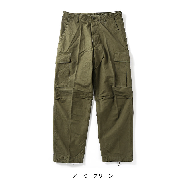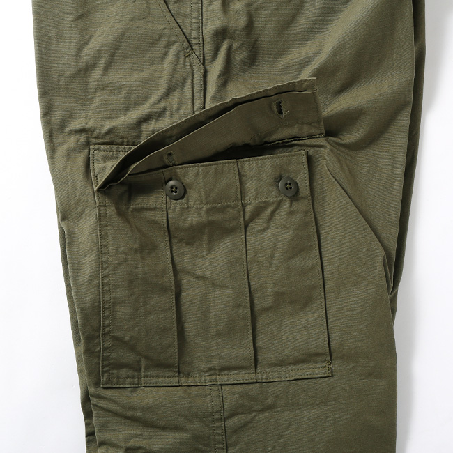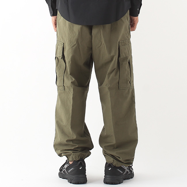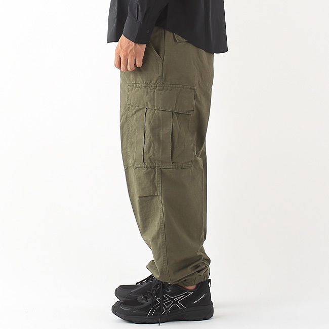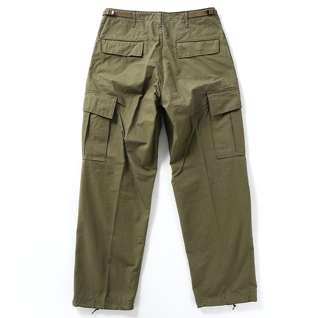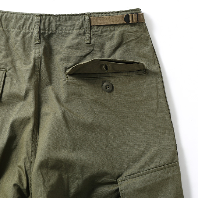 60年代のベトナム戦争時に採用された「ジャングルファティーグ」をベースにデザインされており、太めのシルエットが特徴。サイドの大きなタック入りポケットや、裾の丸紐ドローコードなど、当時のディテールを随所に取り入れています。