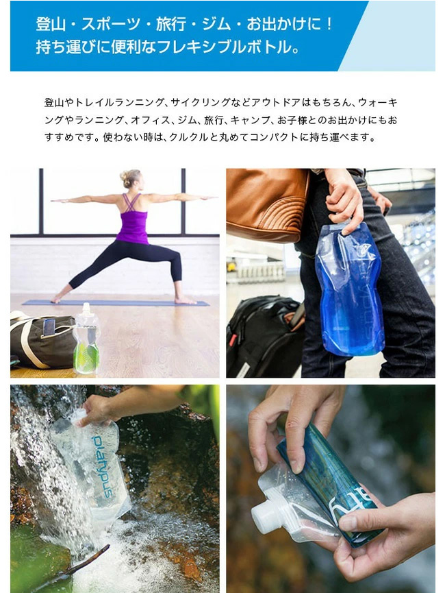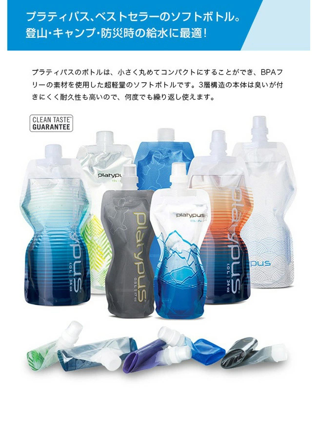 アウトドアにおける水筒の概念を一新したソフトボトルは、発売から20年が過ぎた今もプラティパスを代表する製品です。クリーンで環境に優しくフレキシブル。