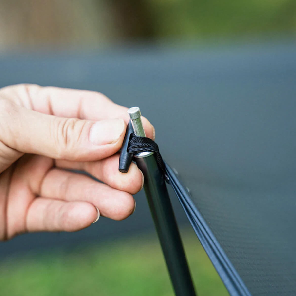 120-140cmの5段階の5cmピッチで長さ調整が可能で、先端はタープのハトメやループから外れにくい形状です。