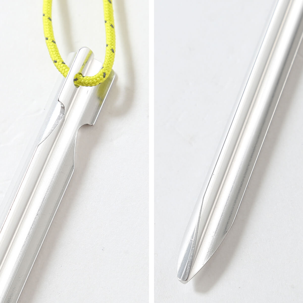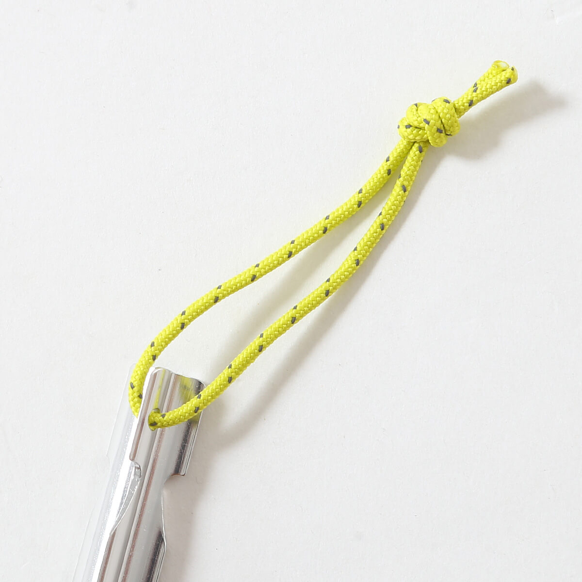 NINJA SHELTERに付属している、アルミニウム製のペグ4本セットです。鮮やかなグリーンのパラコード付きで、引き抜きやすいよう工夫されています。