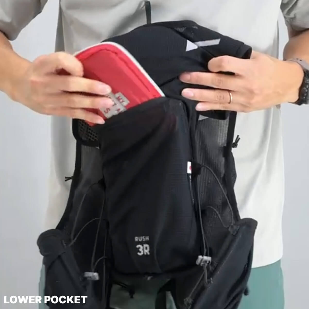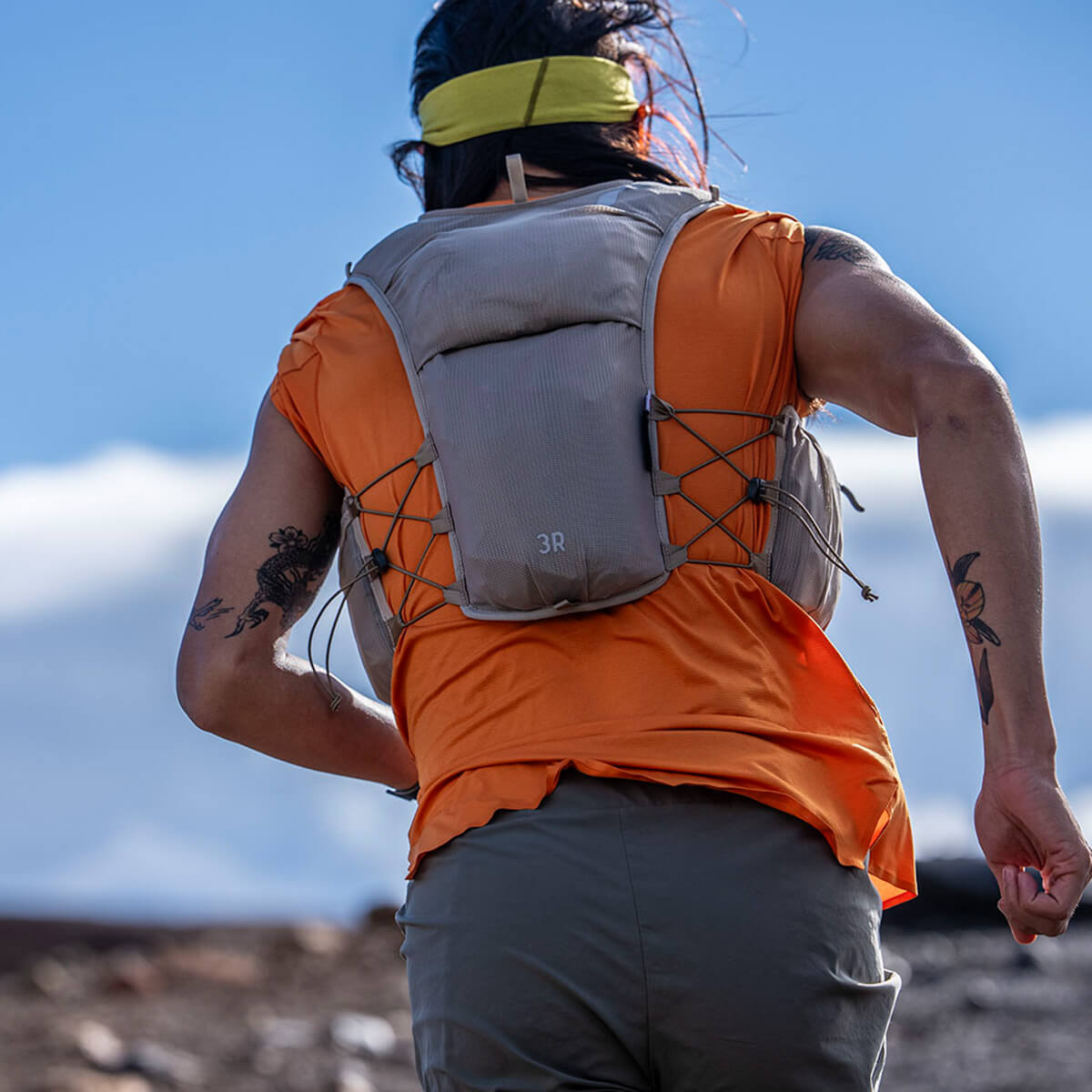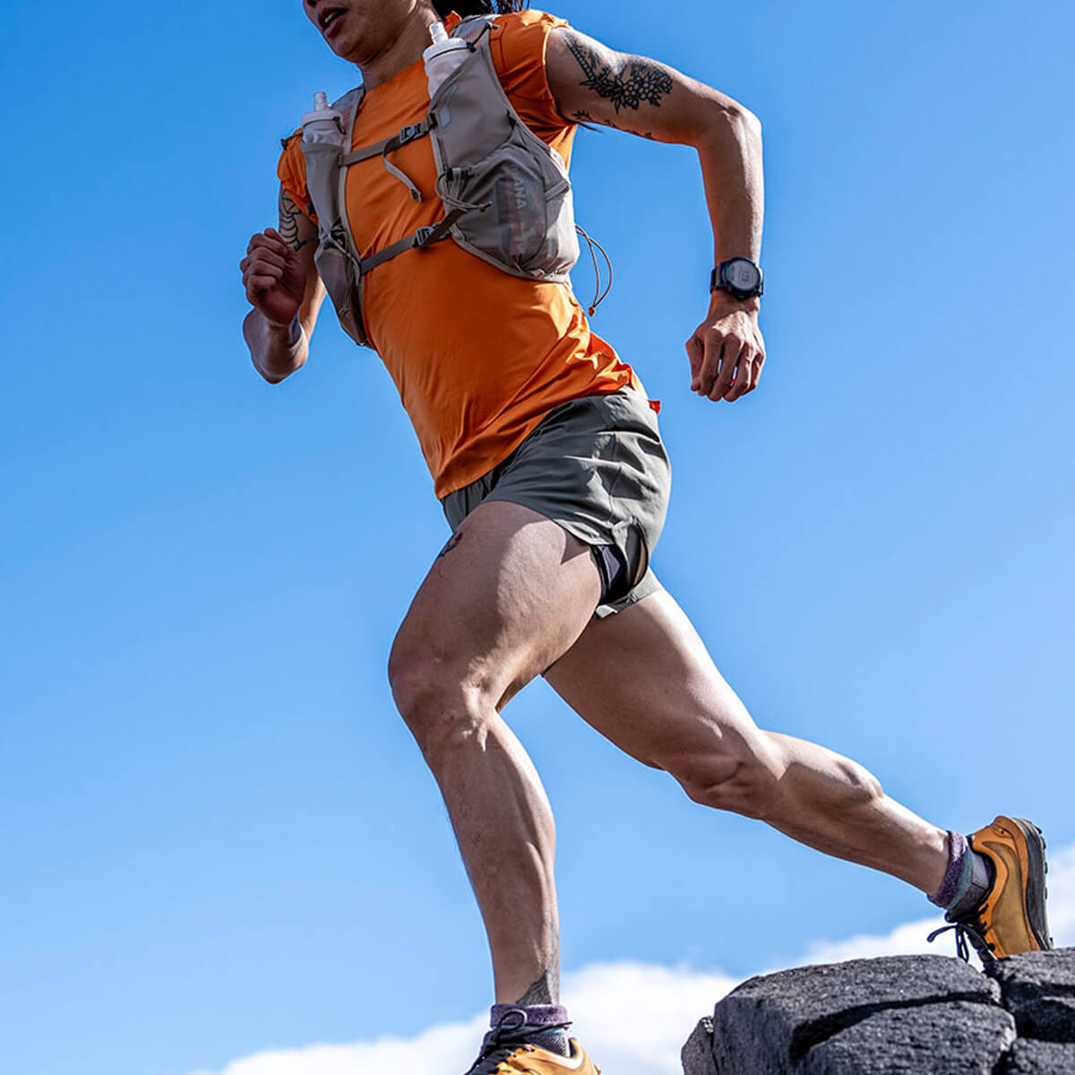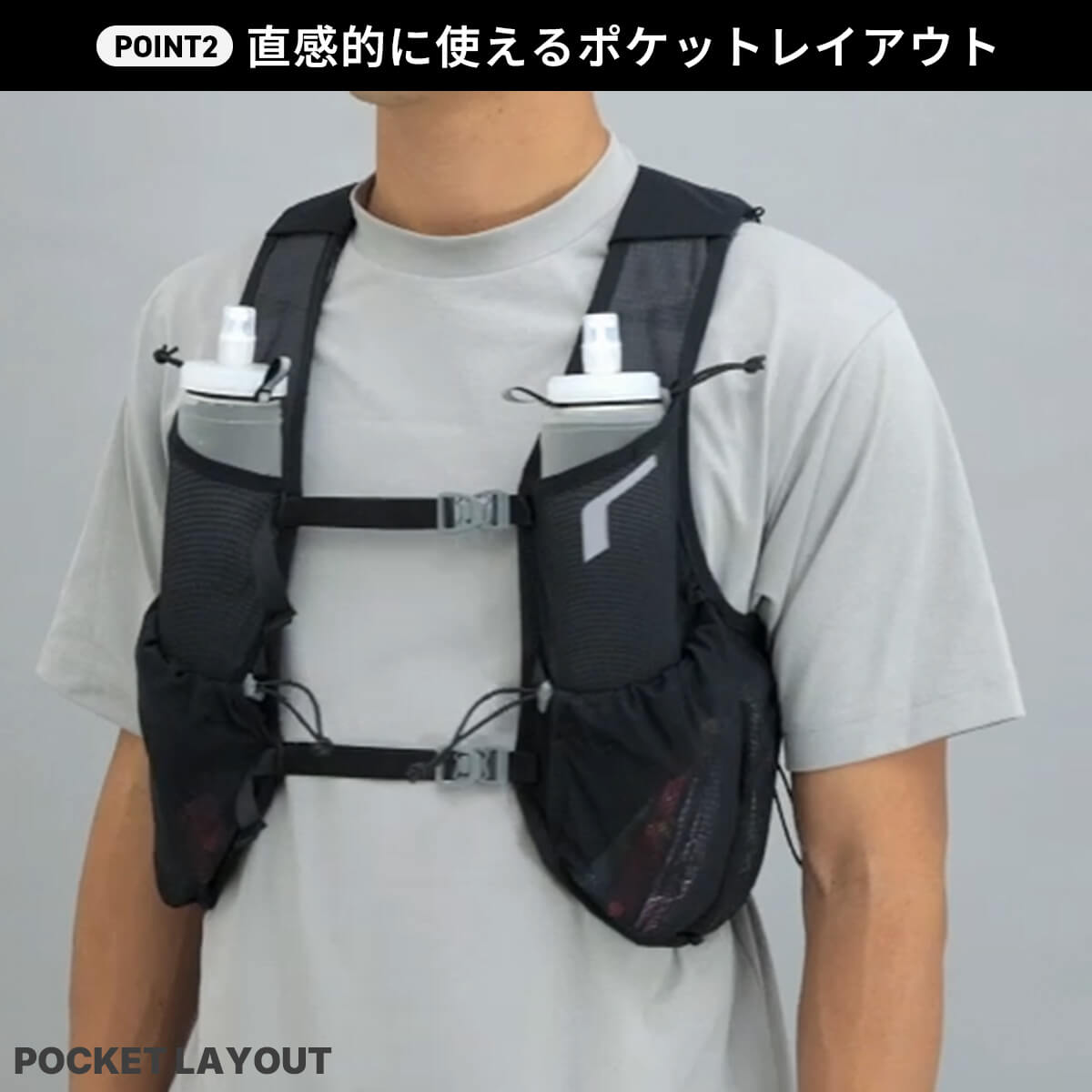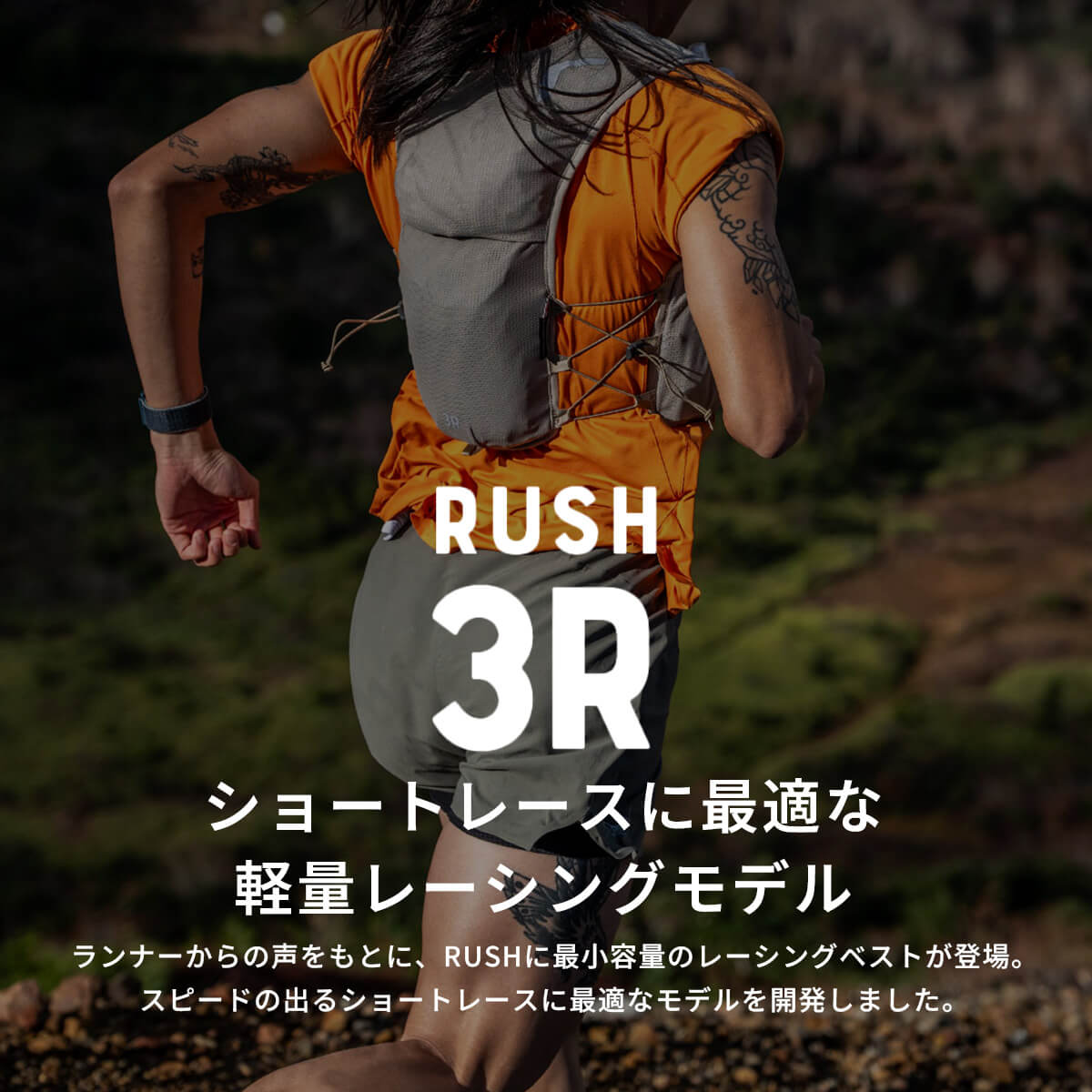 ランナーからの声をもとに、RUSHに最小容量のレーシングベストが登場。腕の可動を妨げない新設計と、激しい運動時でも熱がこもりにくい素材によって、スピードの出るショートレースに最適なモデルを開発しました。