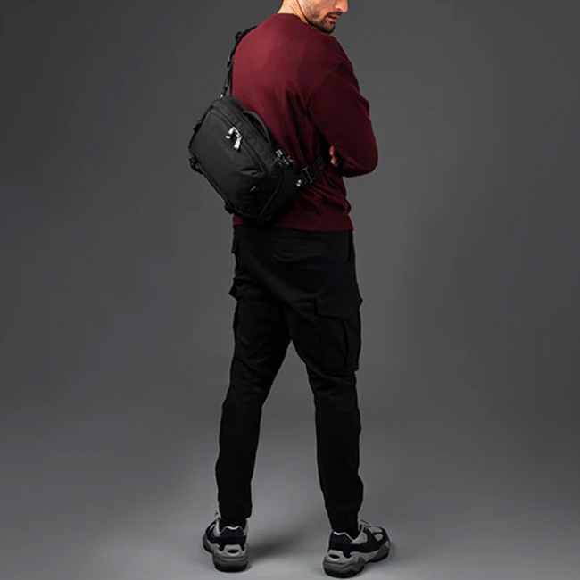 クロスボディバッグまたはスリングパックとして2通りの着用方法が可能な盗難防止機能付きのボディバッグです。