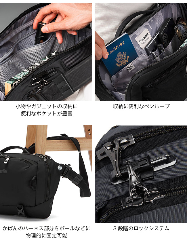 3箇所のロック可能なコンパートメントを備えており、小物やガジェットの収納に便利なポケットが豊富で、ポーチがなくてもすっきりと荷物を持ち運ぶことができます。ノートPCやタブレットを収納できる専用コンパートメントの他にメインコンパートメントには他の荷物を収納するのに十分なスペースがあります。