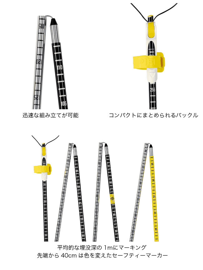 平均的な埋没深の1mにマーキング、先端から40cmは色を変えたセーフティーマーカーにすることで埋没者までの距離を視覚的に示します。■ブランド名:PIEPS