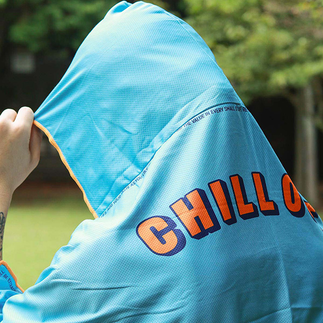 気化熱の作用により、ひんやりとした冷感が得られるクーリング機能を備えたフーディタオルです。暑い季節でも快適な使い心地で、屋外シーンを心地よくサポートします。