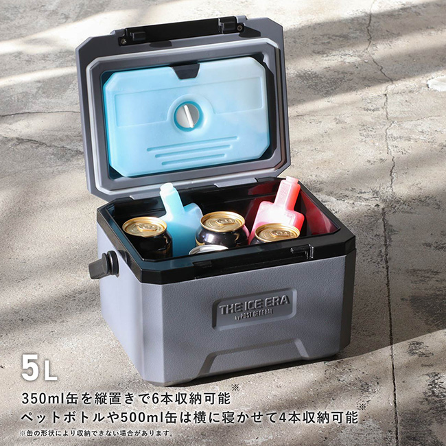 蓋の裏面から冷気が下がり、効率的に庫内を保冷できます。5Lサイズのクーラーボックスは、350ml缶が縦置きで6本、ペットボトルや500ml缶は横に寝かせて4本収納できるインナーサイズです。