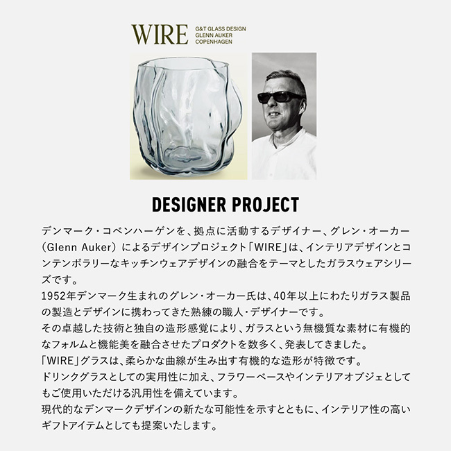 コペンハーゲンを拠点に活動するプロダクトデザイナー、グレン・オーカーによってデザインされたグラスウェア「WIRE」。インテリアとコンテンポラリーなキッチンウェアの融合をテーマに生まれた、アート性と実用性を兼ね備えたガラス器です。