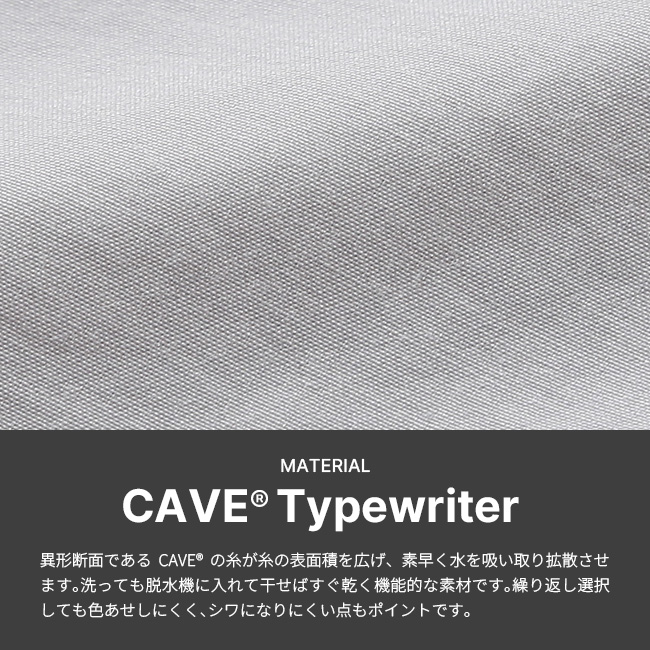 コットンタッチなポリエステルのCAVE®糸を使用したタイプライターです。異形断面であるCAVE®の糸が糸の表面積を広げ、素早く水を吸い取り拡散させます。