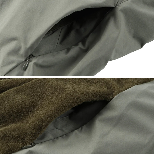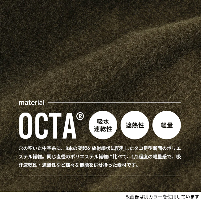 表地には目付けわずか87g/m²で撥水性/透湿性のあるコットンタッチの2wayストレッチポリエステルを、裏地には帝人のOcta®を採用しました。雨風をある程度防ぎながら、通気性のある表地を採用しているので、裏地のOcta®がHIKEやBIKEなど汗をかくアクティビティ中も蒸れにくく快適にしてくれます。