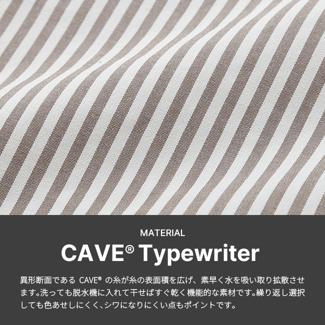 コットンタッチなポリエステルのCAVE®糸を使用したタイプライターです。異形断面であるCAVE®の糸が糸の表面積を広げ、素早く水を吸い取り拡散させます。