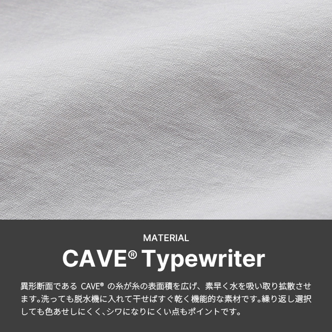 コットンタッチなポリエステルのCAVE®糸を使用したタイプライターです。異形断面であるCAVE®の糸が糸の表面積を広げ、素早く水を吸い取り拡散させます。