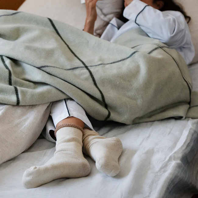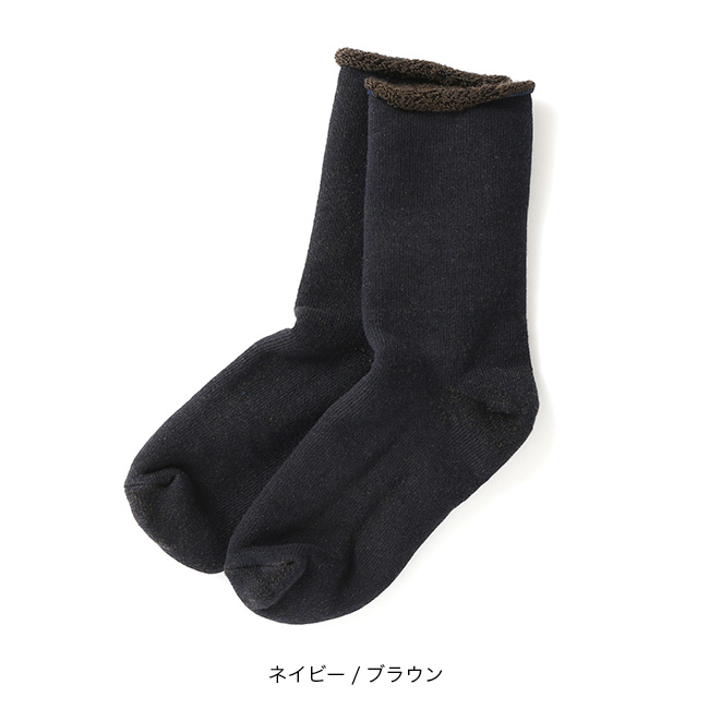 冷え性の方の「足が寒くて眠れない」という声から生まれたソックスです。眠りを妨げないよう履き口にはゴムを入れず、靴下全体も締めつけの少ない、足を包み込むようなソフトなフィット感に仕上げています。