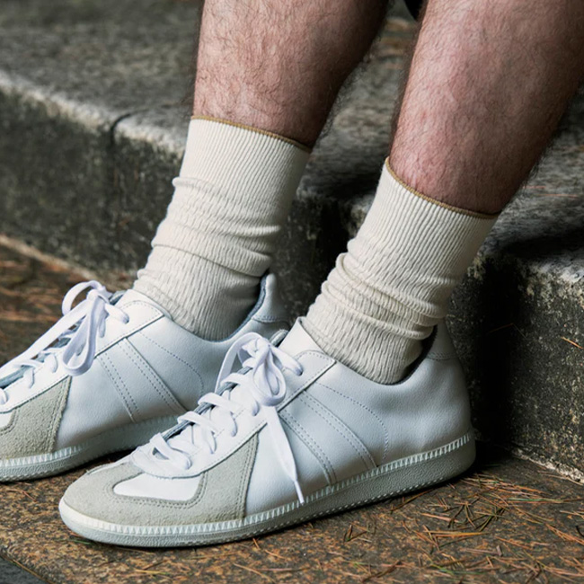 着用時に立体的な編み目が浮かび上がるよう設計されており、スニーカーにも革靴にも合わせやすい、程よい肉感に仕上げています。