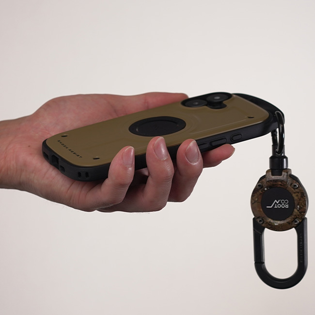 ケース上部に搭載されたカラビナループに、別売りのマグネット式リールカラビナ「MAG REEL 360」やスマホショルダーストラップ「UTILITY WEBNING NECK/SHOULDER LOOP」を取り付ける事が可能。もちろんお手持ちのカラビナ等を装着することもできます。