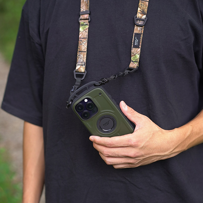 ケース上部に搭載されたカラビナループに、別売りのマグネット式リールカラビナ「MAG REEL 360」やスマホショルダーストラップ「UTILITY WEBNING NECK/SHOULDER LOOP」を取り付ける事が可能。もちろんお手持ちのカラビナ等を装着することもできます。