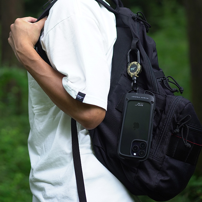 ケース下部2つのカラビナループに、別売りのマグネット式リールカラビナ「MAG REEL 360」、スマホショルダーストラップ「UTILITY WEBNING NECK/SHOULDER LOOP」を取り付ける事が可能。もちろんお手持ちのカラビナ等を装着することもできます。