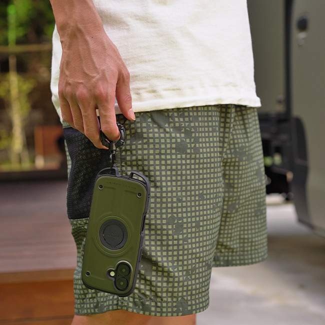 ケース上部に搭載されたカラビナループに、別売りのマグネット式リールカラビナ「MAG REEL 360」やスマホショルダーストラップ「UTILITY WEBNING NECK/SHOULDER LOOP」を取り付ける事が可能。もちろんお手持ちのカラビナ等を装着することもできます。