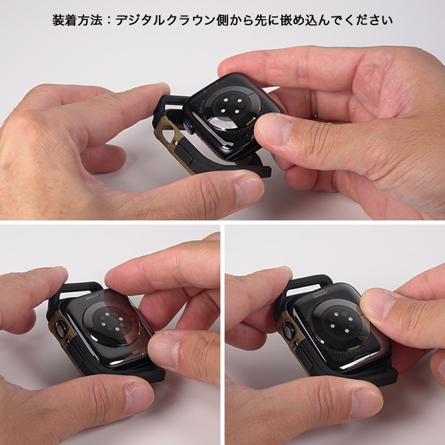 Apple Watch本体を本ケースに嵌め込む際は、「デジタルクラウン側」から先に嵌め込むんでください。(取り外しの際はデジタルクラウンと逆側から押し出すように取り外します。)