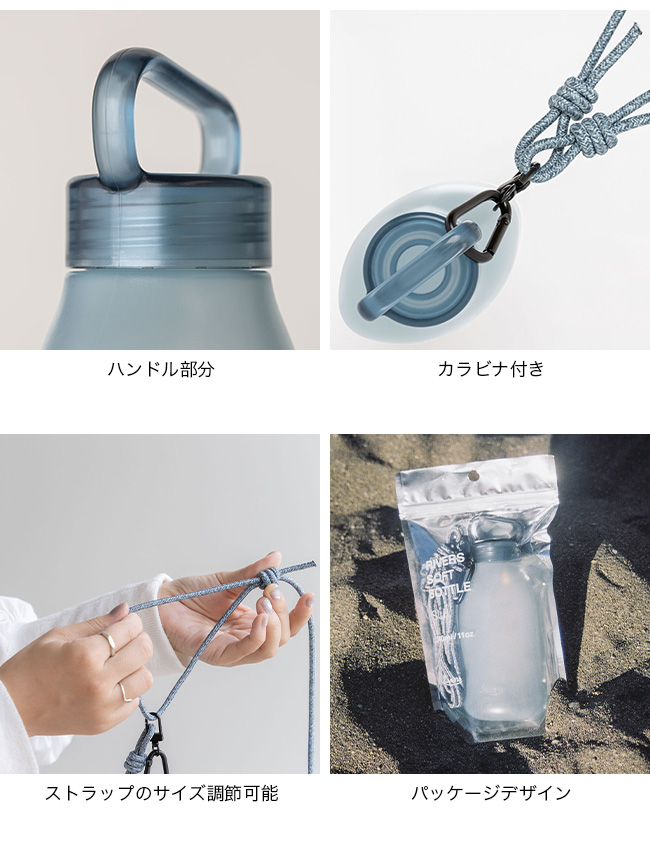 ■素材:ポリエチレン(本体)/飽和ポリエステル樹脂(フタ)/シリコーンゴム(フタ)/ナイロン(ストラップ)/ポリエステル(ストラップ)/アルミニウム(カラビナ)