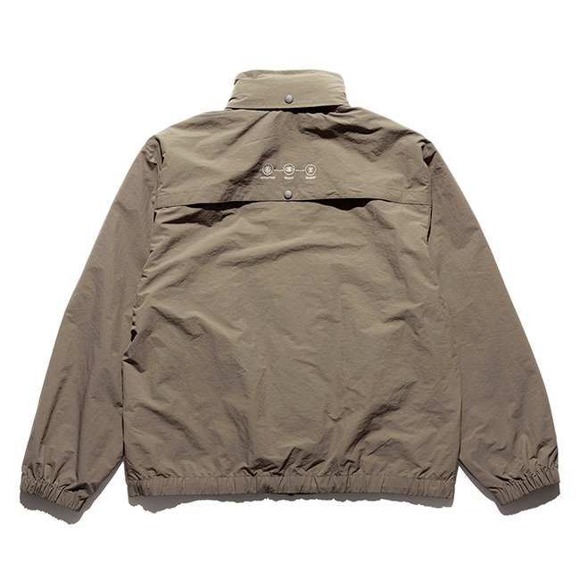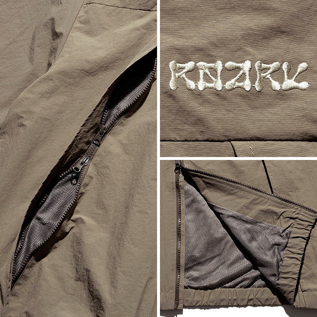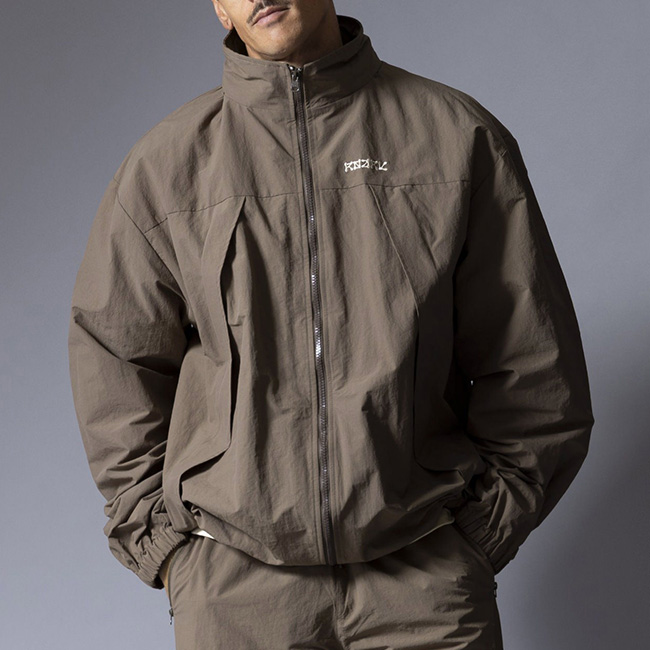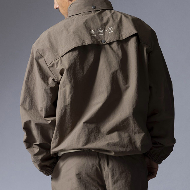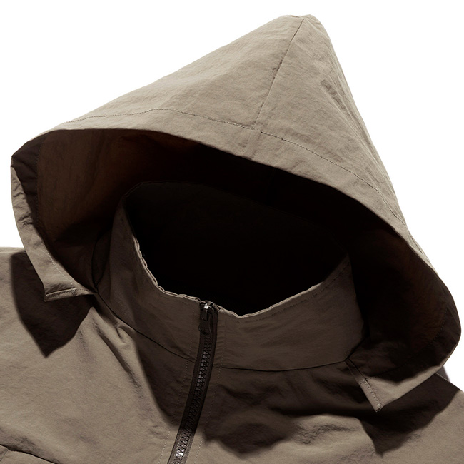独特のシワ感と軽さのあるナイロン生地を使用し、身幅や着丈がゆったりとしたシルエットで、ボディに配した大きなダイアゴナルジップが特徴的です。裾はドローコード仕様でシルエットの調整が可能。