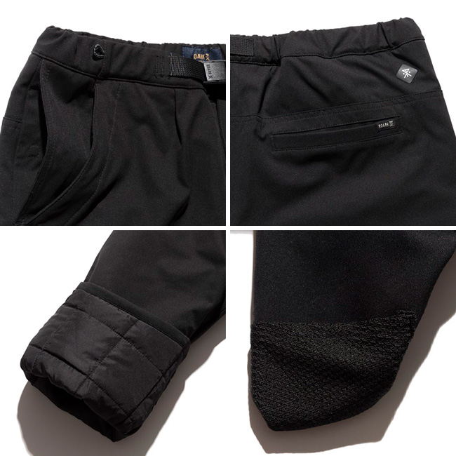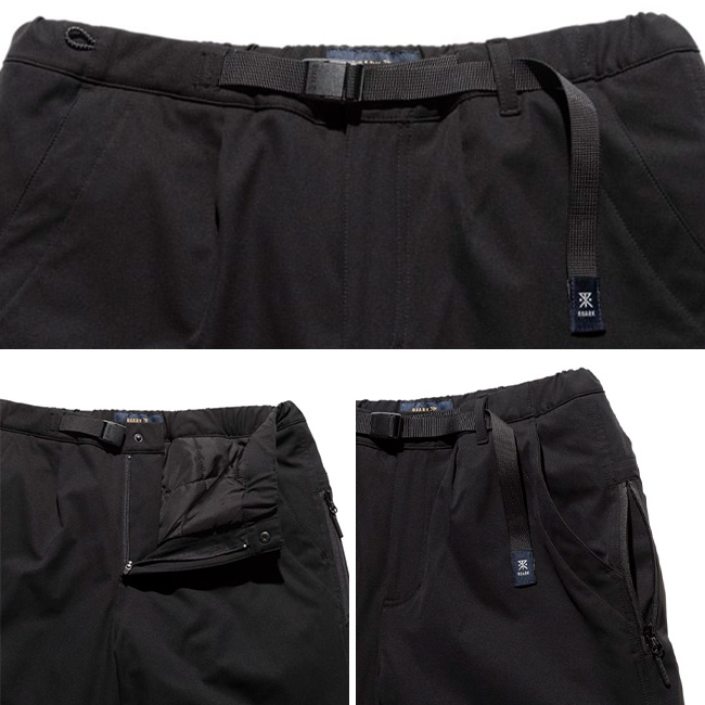 ウエストは片手でも調整可能で、ウェービングベルトにはROARKのブランドアイコン、バックポケットにはブランドロゴがあしらわれています。