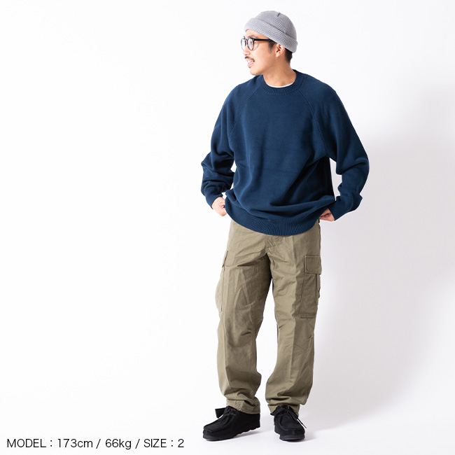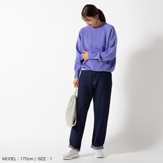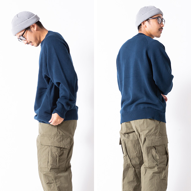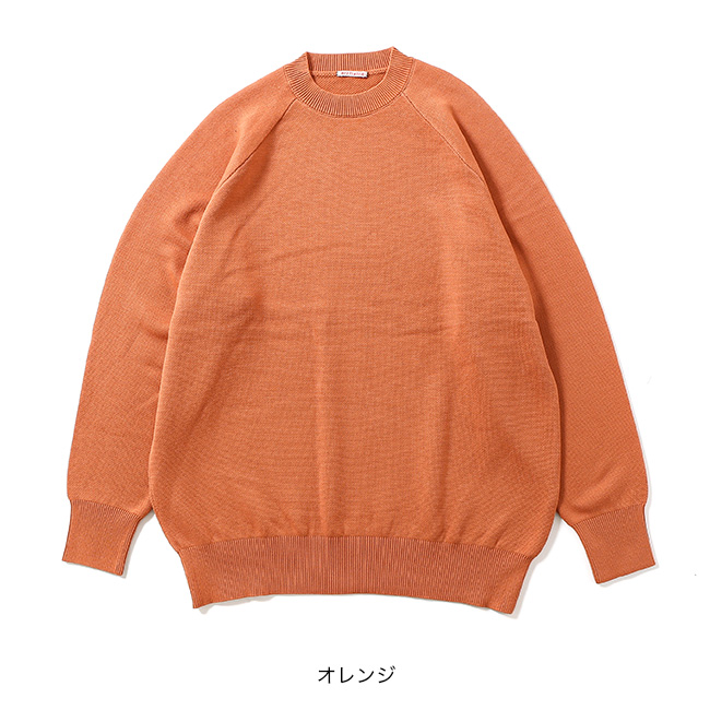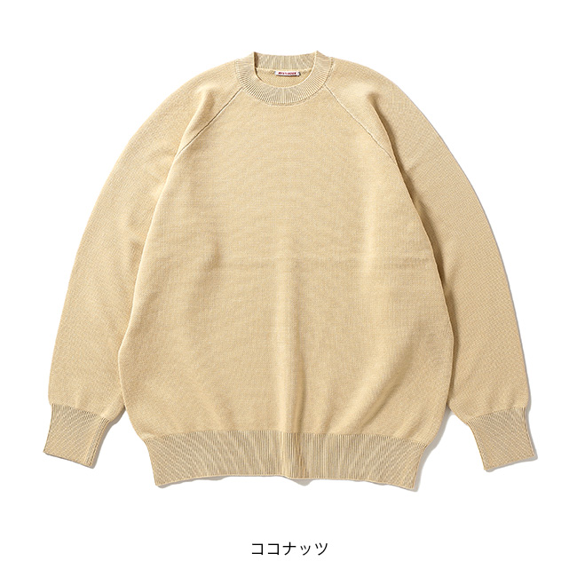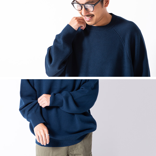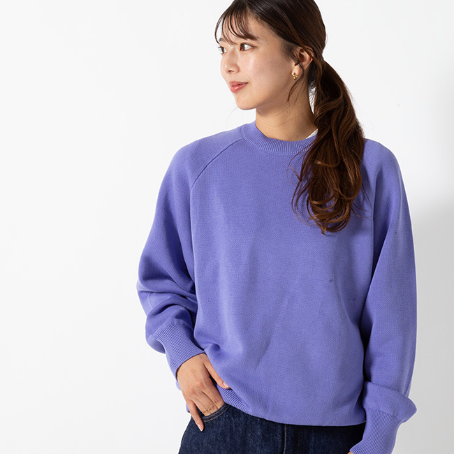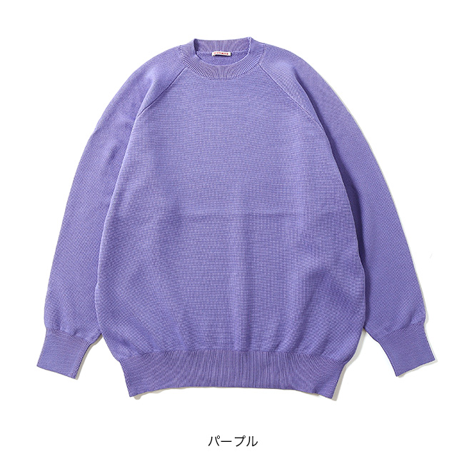 裏目を飛ばすスレッド編みを採用し、スウェット生地のようなループを再現することで、柔らかさとしなやかさが生まれます。オーセンティックな直線のラグラン線で懐かしみのあるクラシックな一枚。