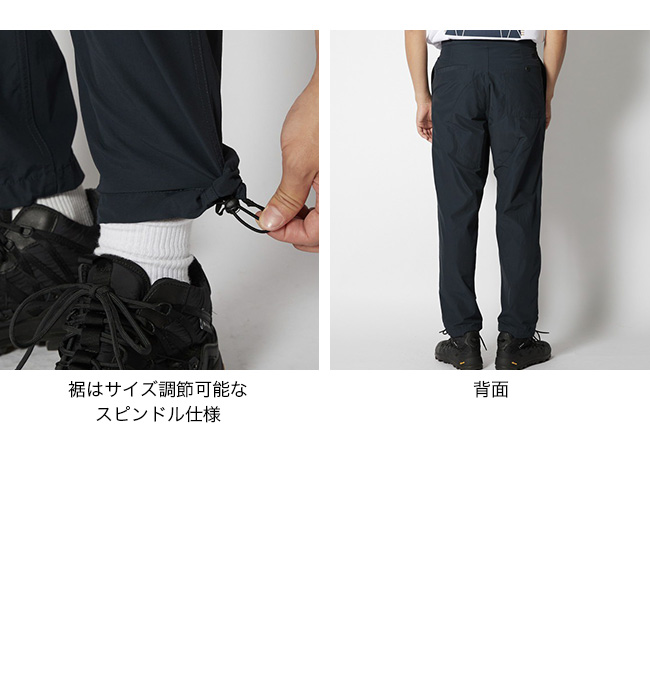 ウエストと裾はサイズ調整スピンドル仕様に。