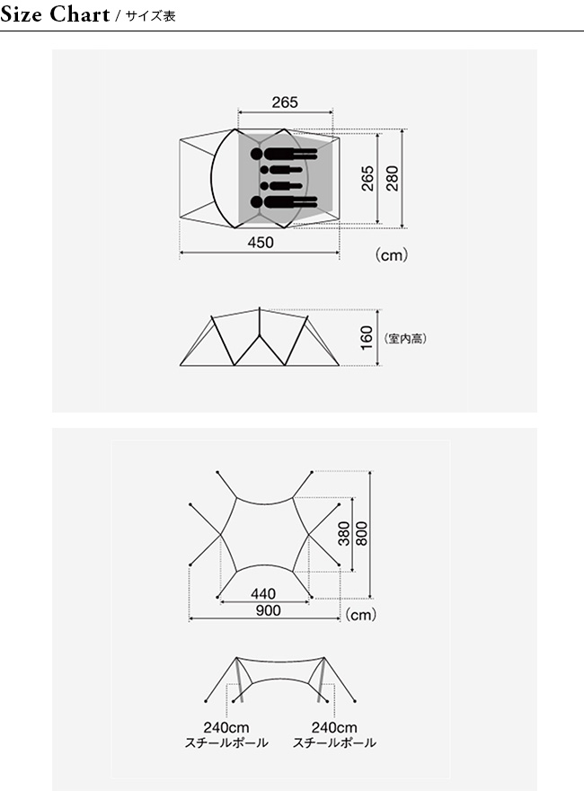 寝室(テント)は3-4名対応で、前後設定の無いフライシートと自立式可能なフレームワークで簡単に設営が可能です。