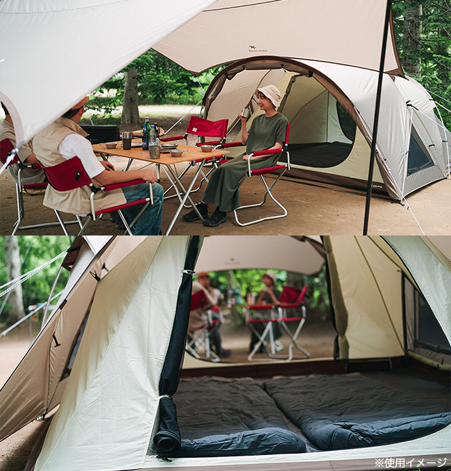 開放的なリビングスペース(タープ)と寝室(テント)を手軽に設営することができます。