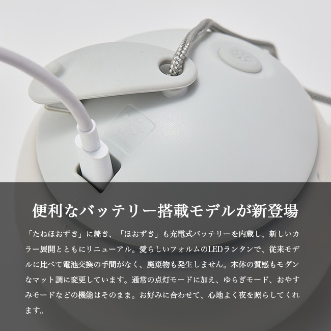 「たねほおずき」に続き、「ほおずき」も充電式バッテリーを内蔵し、新しいカラー展開とともにリニューアル。愛らしいフォルムのLEDランタンで、従来モデルに比べて電池交換の手間がなく、廃棄物も発生しません。