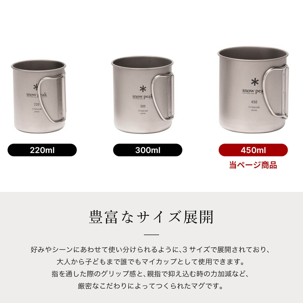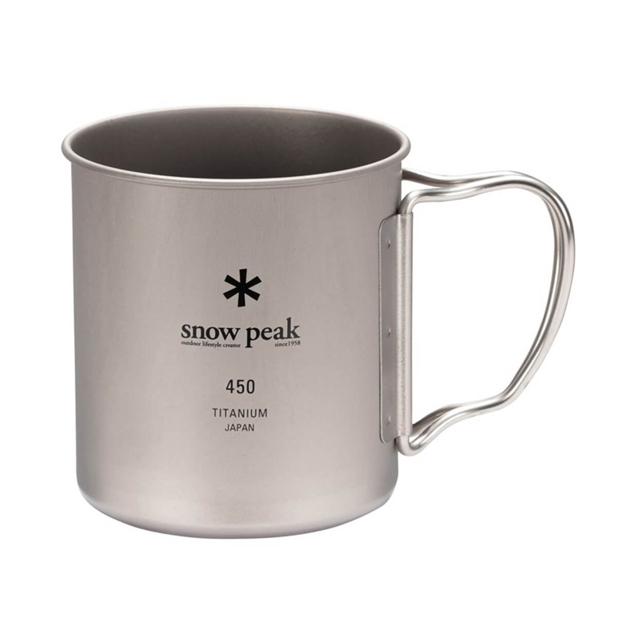 容量450mlのチタンシングルマグ。ハンドルは収納時には折り畳め、使用時には握りやすい形状です。