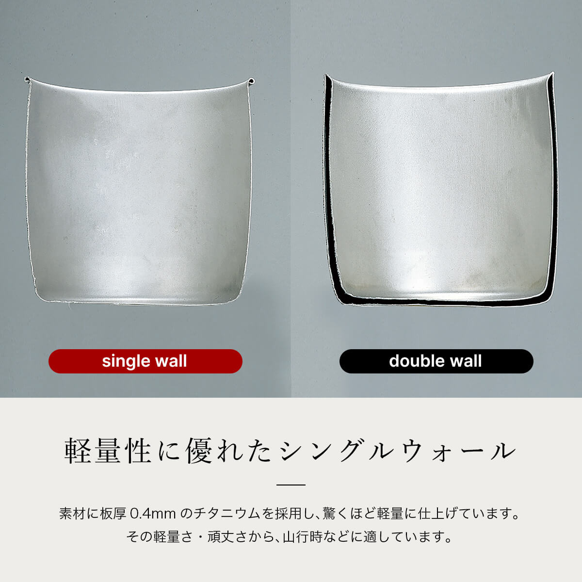 軽さを追求した、シングルウォールのチタンマグカップ。