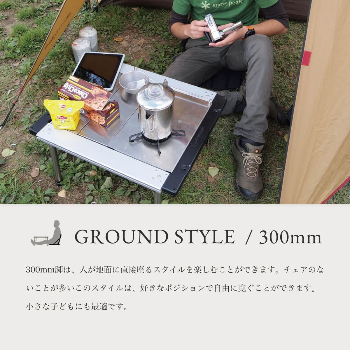 IGTパーツの4種類ある脚の中で最も短い300mm脚は、人が地面に直接座るスタイルを楽しむことができます。