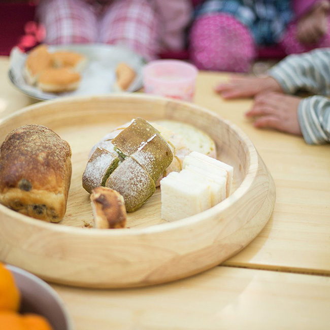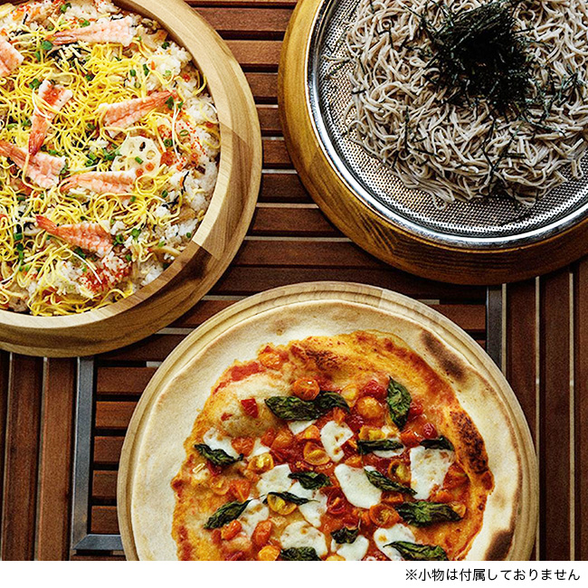 木皿、浅型ザル、浅型ボウルのセット。組み合わせを変えることで、ピザ、ざるそば、寿司など、大人数で楽しむさまざまな料理に対応します。