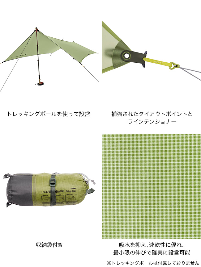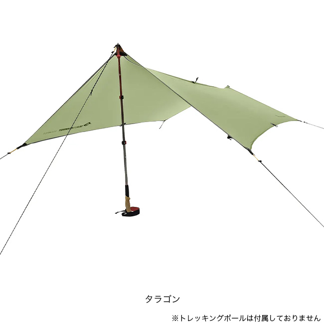 トレッキングポールを使って素早い設営が可能です。2026年モデルからウルトラシルLS 15Dナイロン/30Dポリエステルリップストップ生地を使用。