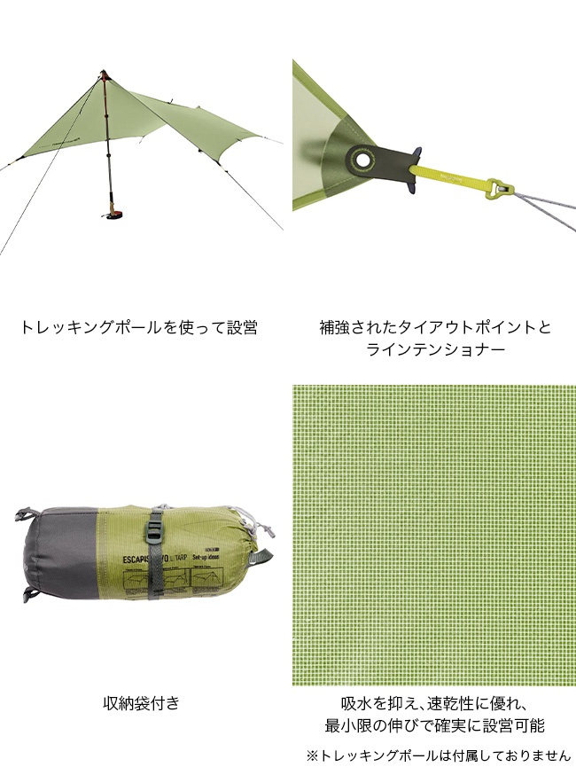 トレッキングポールを使って素早い設営が可能です。2026年モデルからウルトラシルLS 15Dナイロン/30Dポリエステルリップストップ生地を使用。