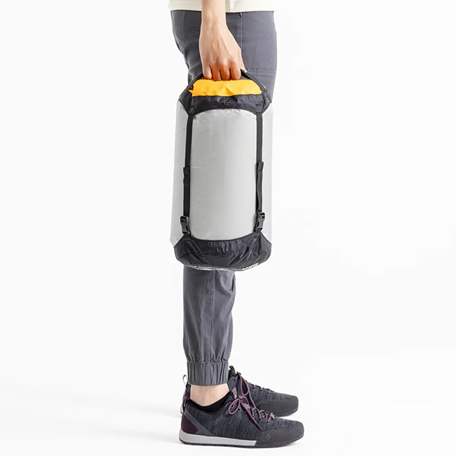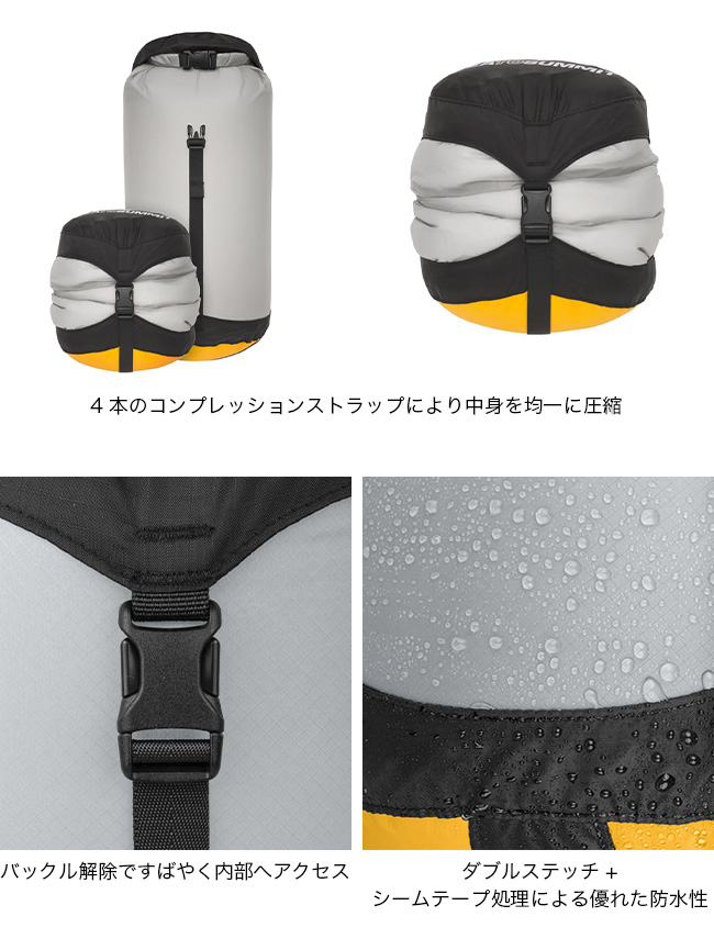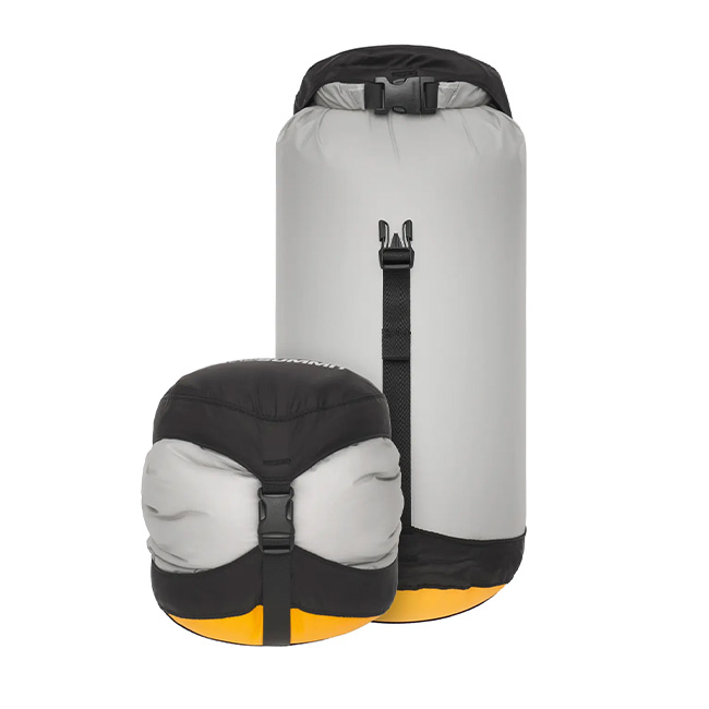 コンプレッションドライサックをベースにして、本体生地に30Dウルトラシルナイロンを使用し、40%も軽量化したモデル。ボトムに使用されている防水透湿素材eVentファブリックは、空気は出しても水は入れない構造。