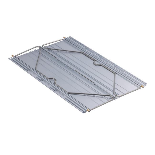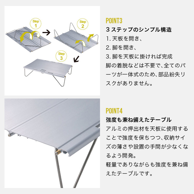 アルミの押し出し材を天板に使用することにより強度を保ち、全てのパーツが一体式のため、煩わしい組立てや部品紛失のリスクがありません。