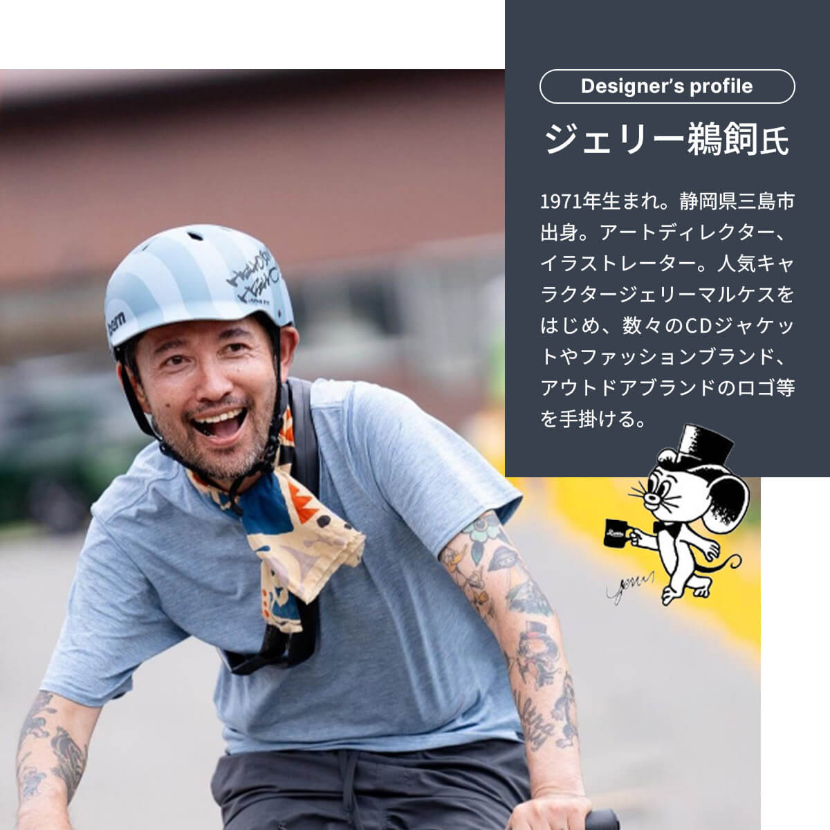 アウトドア界わいでお馴染みの人気キャラクター、ジェリーマルケスの生みの親でアートディレクター、イラストレーターのジェリー鵜飼さんに、SUNDAY MOUNTAINのための特別なグラフィックを描いていただきました。モチーフはジェリーさんも描いたことなかったという恐竜です。
