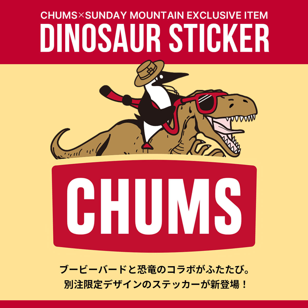 人気アウトドアブランドCHUMSと、自然豊かでメガネと恐竜が有名な福井県に拠点を置くサンデーマウンテンが、再びタッグを組み、スペシャルな別注アイテムをプロデュース!チャムスのアイコンであるブービーバードが、福井が世界に誇る「恐竜大国」にちなみ、なんと恐竜に乗って登場!