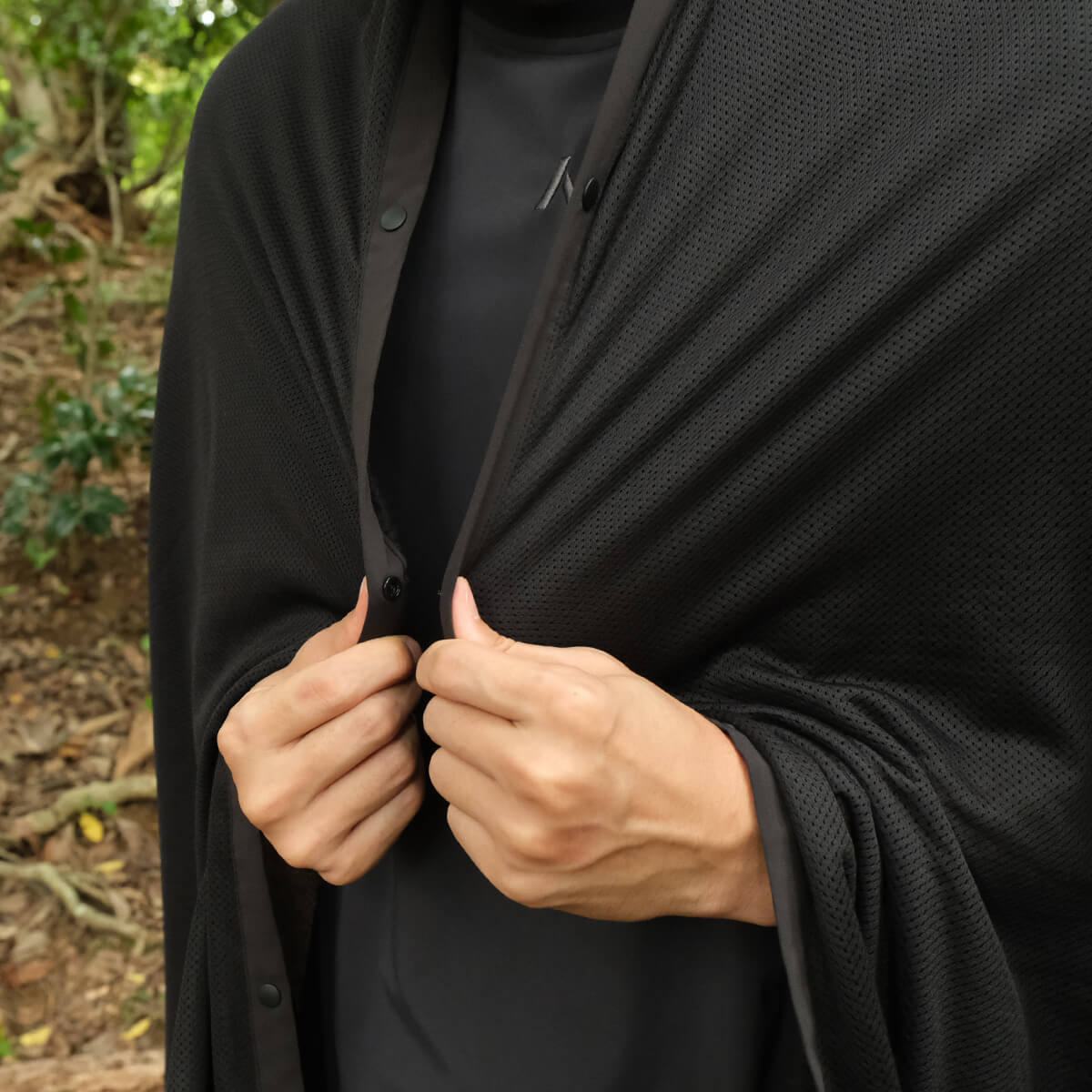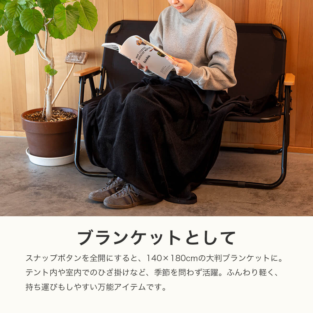 シュラフの中でのインナーライナー用途を想定した製品ですが、スナップボタンを全開にすれば140cm×180cmの大判ブランケットに。