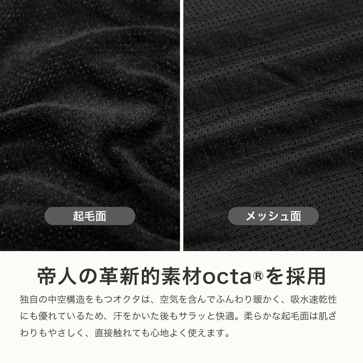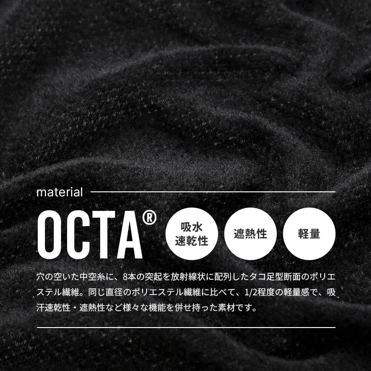 アクシーズクインが展開する日本のアウトドアブランド「凌(シノギ)」のカルフワシリーズから着想を得て生まれた、Octa素材(オクタ)の新たなライナーです。独自の中空構造をもつオクタは、空気を含んでふんわり暖かく、吸水速乾性にも優れているため、汗をかいた後もサラッと快適。