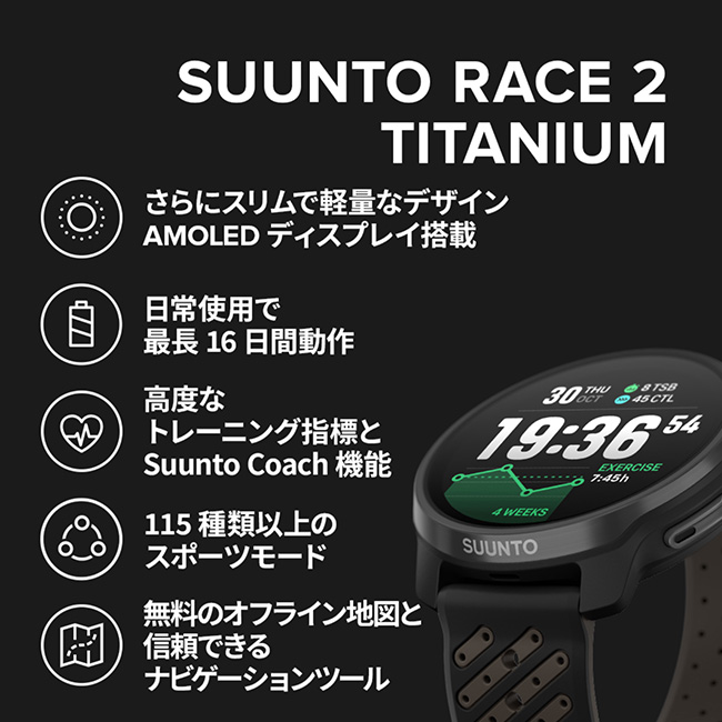 Suunto Race 2 は、重要な場面で最高のパフォーマンスを発揮したいアスリートのためのトレーニング&レース用ウォッチです。大きく明るいAMOLEDディスプレイ、精度が向上した心拍測定、クラス最長クラスのバッテリーと高速充電を搭載。